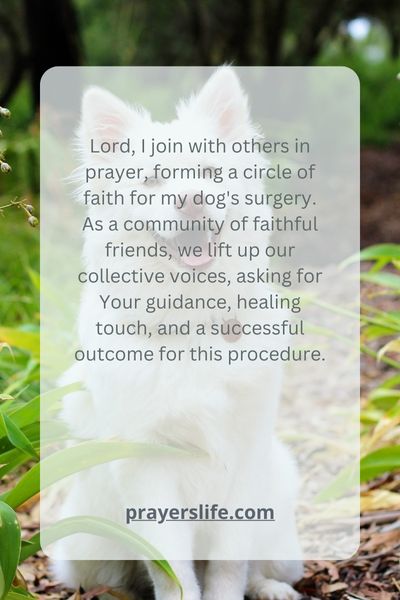 Lord, I join with others in prayer, forming a circle of faith for my dog’s surgery. As a community of faithful friends, we lift up our collective voices, asking for Your guidance, healing touch, and a successful outcome for this procedure.